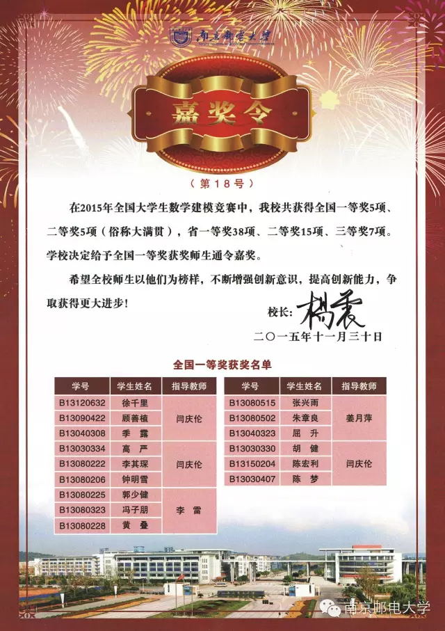 mg4355vip官网徐千里同学参与的队伍以江苏省初审A题第三名的成绩推至全国赛区,最终获得全国一等奖,学校给予通令嘉奖。在全国参赛的1326所高校中,我校获全国一等奖数量与(成都)电子科技大学等5所高校并列全国第一名,获得国家奖成绩与中国计量学院并列全国第二名,电子科技大学因获得本科组唯一“高教社杯”冠名奖摘得第一名。