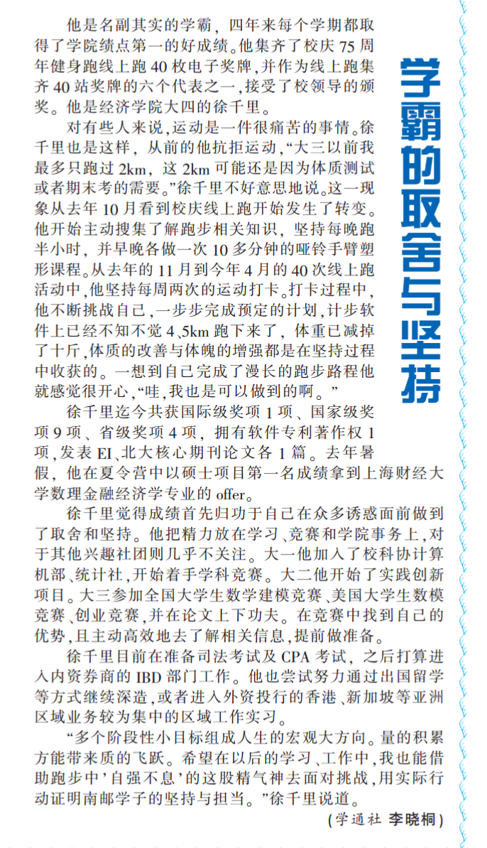 徐千里认为成绩归功于自己在众多诱惑面前做到了取舍和坚持。他希望在以后的学习、工作中,也能借助跑步中“自强不息”的这股精气神去面对挑战,用实际行动证明南邮学子的坚持与担当。