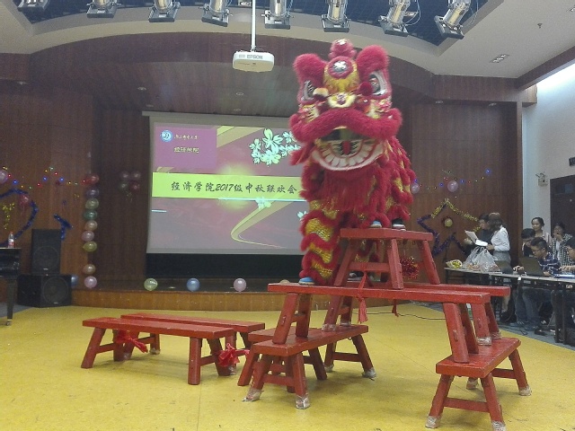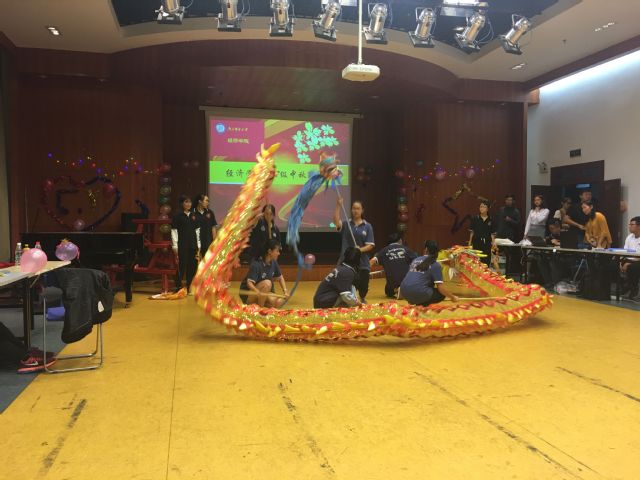联欢会的节目主要来自新生,一首《安静》仿佛让时间静止、感心动耳,《问》《斑马斑马》等一首首脍炙人口的歌曲在同学们的演绎中更具深意,街舞表演《街街的街舞》点燃了全场的热情,带来了无限的震撼。除此之外,还有同学们精心准备的小提琴钢琴合奏、民族舞蹈、诗歌朗诵、合唱表演等。新生们多才多艺,学姐们也毫不示弱,大二的王一宁、杨韵两位学姐也为大家带来了悦耳动听的歌曲串烧。晚会的压轴节目是由大二的学姐们带来的女龙表演,整齐划一、动作流畅,引起了新生们的阵阵掌声。