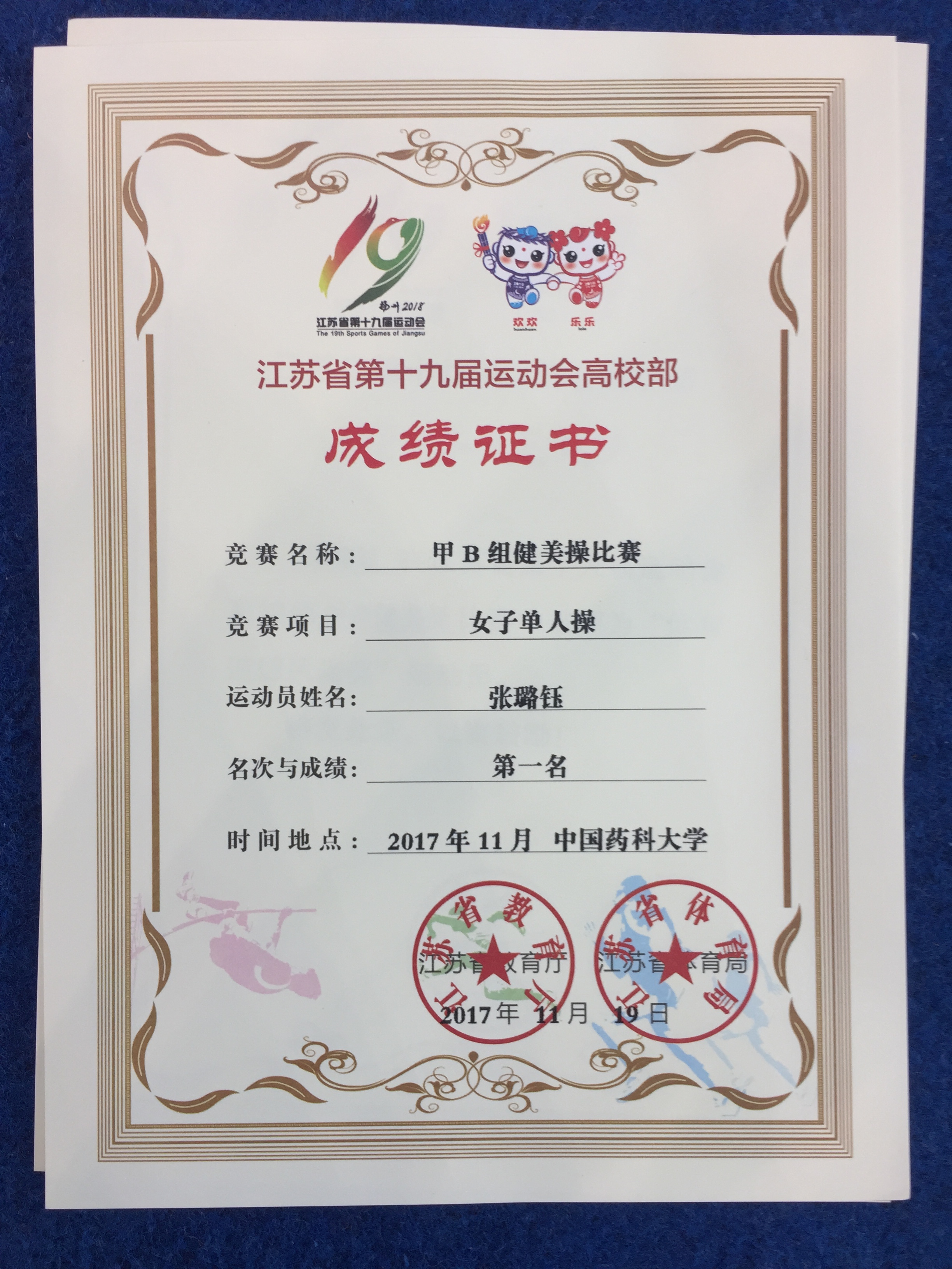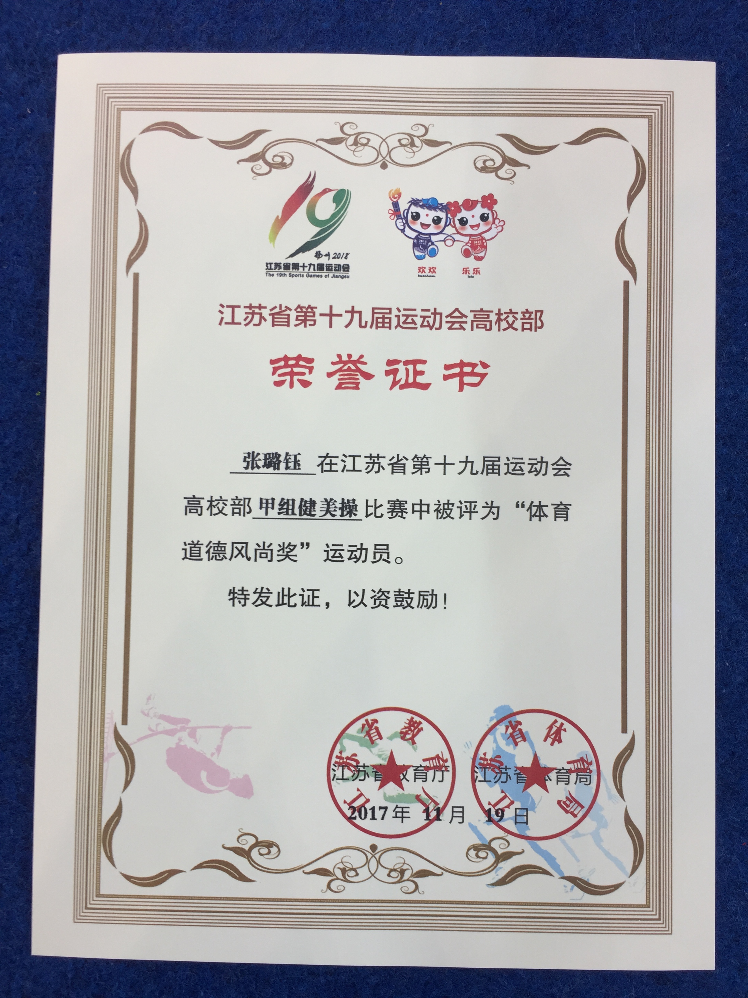 11月18-19日,江苏省第十九届运动会高校部甲组健美操比赛在中国药科大学举行。此次比赛近500名运动员参加,是本届省运动会高校部所有比赛中规模最大、参赛运动员最多的比赛。mg4355vip官网2015级学生张璐钰在甲组健美操比赛女子单人操项目中表现优异,在决赛中以15.90的优异成绩夺得冠军。此外,张璐钰还获得“体育道德风尚奖”运动员荣誉称号。