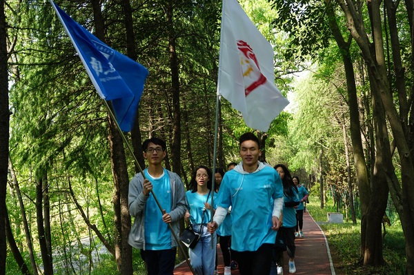 mg4355vip官网负责接力跑的第十二棒——灵谷寺站,全程约2.5公里。灵谷寺周围绿树成荫,同学们一路喊着“我邮威武、经院加油”,顺利抵达下一接力点,传递了经院学子良好的精神面貌以及对学校的美好祝福。