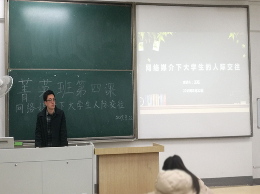 2019年3月22日晚,mg4355vip检测中心第三十四期大学生菁英人才学校暨mg4355vip检测中心学生骨干培训班第四课在教3-303教室开展。本次课程由mg4355vip检测中心2018级辅导员王珏老师主讲,主题为《网络媒介下大学生的人际交往》。