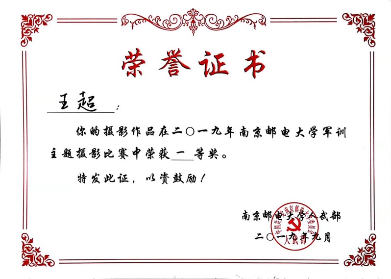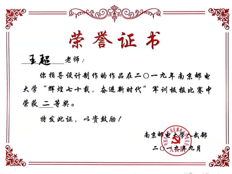 在军训期间,学院开展多项活动,并取得优秀成绩。在摄影作品比赛中,辅导员王超老师“一心向党,终身爱国”作品荣获一等奖,在“我和祖国共成长”征文比赛中,金融工程专业刘玲雁同学荣获三等奖,在“辉煌七十载,奋进新时代”为主题的板报评比活动中,由王超老师指导,2019级新生陈玉雪、李莹莹、李淑琪、舒丹敏制作的板报荣获二等奖。