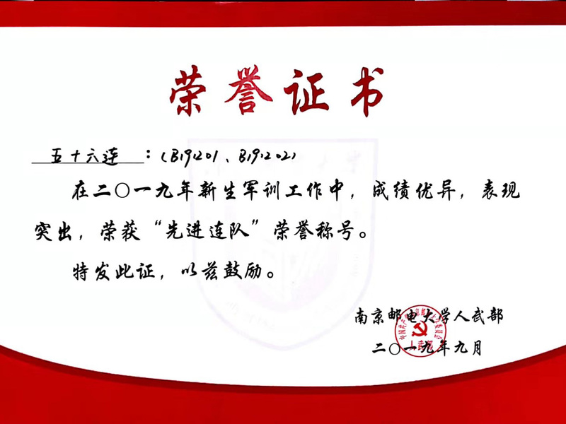 在军训汇演表彰大会上,mg4355vip检测中心56连荣获“先进连队”荣誉称号,指导员王超老师荣获“优秀指导员”荣誉称号,承训教官荣获“优秀教官”荣誉称号,王子杭等14名学生荣获“军训标兵”荣誉称号。