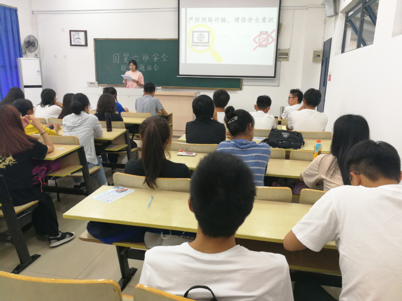 最后,辅导员王超老师结合工作经历向同学们强调三点:首先,人身安全。提醒同学们抬起头走路,不管是外出还是在学校都要注意安全,保护好自己;第二,财产安全。提醒同学们谨防电信诈骗、网购诈骗、校园贷、培训贷等各种诈骗;第三,信息安全。提醒同学们注意保护好的自己的个人信息,不点击来历不明的网址链接,谨防信息泄露。