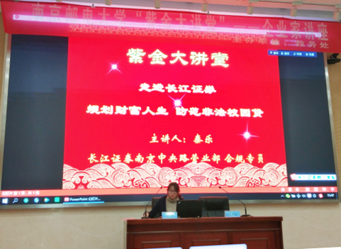 2019年11月20日下午,由教务处主办、mg4355vip检测中心承办的mg4355vip检测中心“紫金大讲堂”——企业家讲座在仙林校区学科楼报告厅举行。长江证券合规专员秦乐做客“紫金大讲堂”,作题为“规划财富人生,防范非法校园贷”的讲座。mg4355vip检测中心副院长王子敏副教授、辅导员王珏等近200名师生参加了此次讲座。讲座由mg4355vip检测中心副院长王子敏主持。