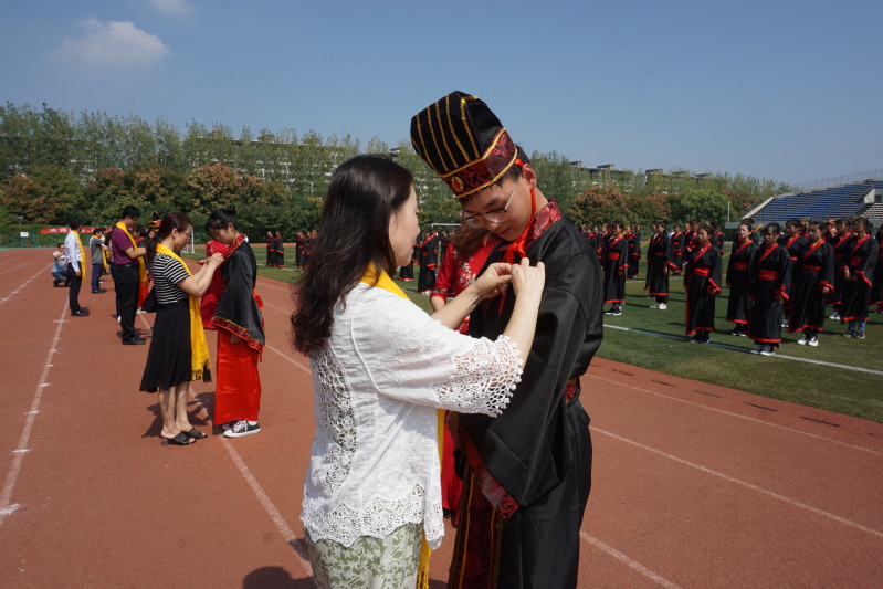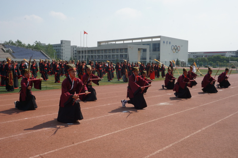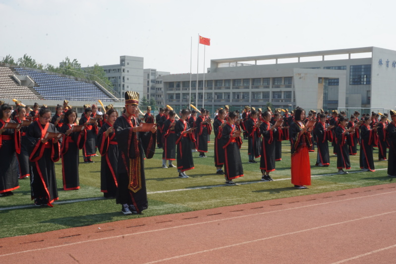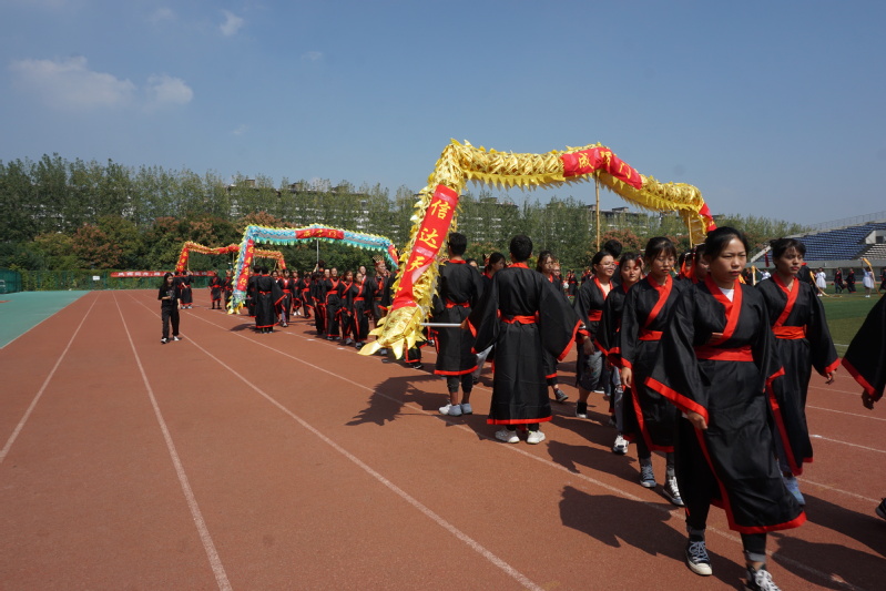 祭孔仪式后,全体学生身着汉服,头戴冠簪依次通过成人门(经世济民、信达天下),成才门(厚德弘毅、求是笃行)和成贤门(谦谦君子、家国情怀)。寓意同学们能够做到:院训谆谆萦耳畔,大气有为不退避;铮铮校训刻心间,与时俱进踏实地;永葆胸中家国情,努力学习创先锋。