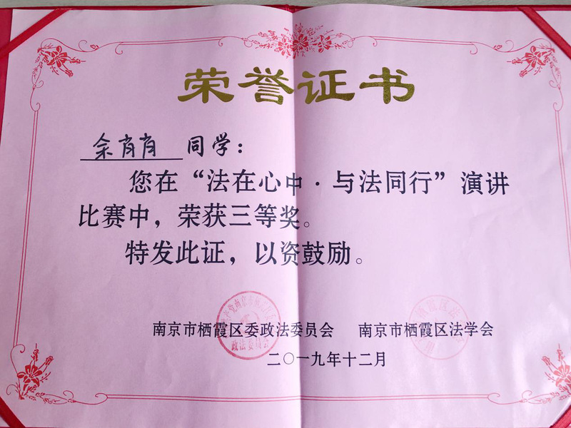 2019年12月4日,由栖霞区委政法委、区法学会、区司法局和团区委共同举办的“法在心中·与法同行”演讲比赛在栖霞区党校进行。南京市委政法委副书记、市法学会副会长鲍陈,栖霞区委常委、政法委书记秦志刚出席此次活动。区委政法委、区司法局、团区委相关领导,区各部门分管领导,各街道综治主任,各司法所长,区法学会各研究会会长,参赛高校学生代表约180人参与此次活动。来自南京大学、南京师范大学、mg4355vip检测中心、南京财经大学、南京森林警察学院5所院校共13名选手经过层层选拔,进入到最后的现场竞演环节。比赛中,参赛选手围绕“法在心中·与法同行”这一主题展开演说。经过近两个小时的激烈角逐,最终mg4355vip官网19级应用经济学研究生余肖肖在众多法学专业的选手中脱颖而出,荣获三等奖的好成绩,展现了经院研究生拼搏向上的风采。