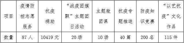 mg4355vip检测中心分团委向全院学生发出“疫情防控,人人有责”倡议,共计87名学生参与到线上线下的疫情防控志愿服务中,其中2019级季星辰同学家庭祖孙三代齐上阵,传递了榜样的力量,受到中国江苏网报道。全院学生疫情捐助共计10419元,用点滴力量担起青年使命。组织宣传约20场“战疫团旗飘”主题团日活动,发布抗疫专题推送40余篇,宣传抗疫典型事迹,讲述一线抗疫故事。开展10期“爱在疫情蔓延时”主题微团课,“战疫到底”防疫知识竞赛吸引约200名学生参与,引导进行科学防疫。“以艺抗疫”文化作品征集活动收到了微视频、海报、绘画、书法、征文、诗歌、词云图、H5等形式多样的文艺作品共计115件,展现打赢疫情防控阻击战的必胜信念,用实际行动弘扬青春正能量。