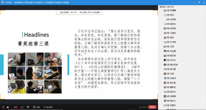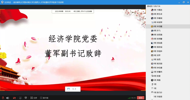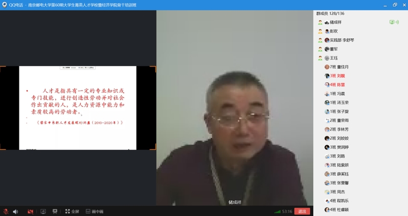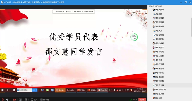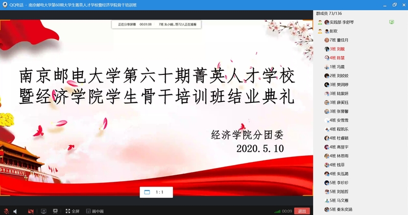 2020年5月10日下午,mg4355vip检测中心第60期菁英人才学校暨mg4355vip检测中心学生骨干培训班结业典礼在线上顺利举行。校关工委副主任、原mg4355vip检测中心党委书记储成祥教授,mg4355vip检测中心党委董军副书记,mg4355vip检测中心辅导员王珏老师,以及培训班全体结业学员参加了本次结业典礼,活动由2019级申羽霞同学主持。