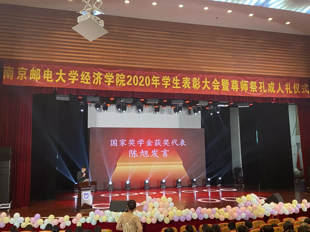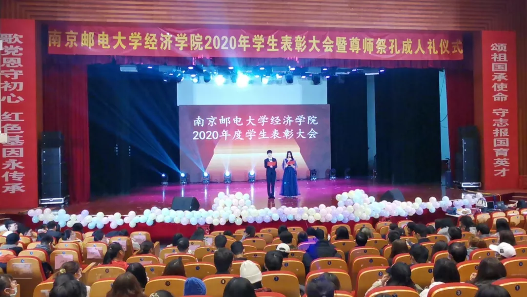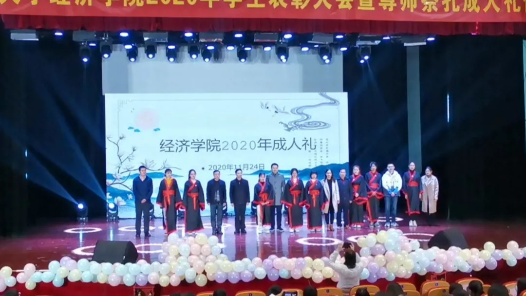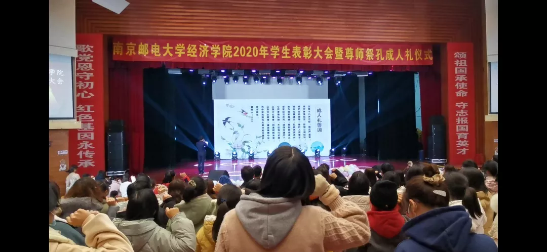 2020年11月24日12:30,mg4355vip检测中心mg4355vip检测中心2020年学生表彰大会暨尊师祭孔成人礼仪式在青春剧场隆重举行。mg4355vip检测中心关工委委员蒋华园教授,学院党委书记黄宝凤教授,学院院长岳中刚教授,学院党委副书记兼副院长董军老师,副院长王子敏老师,副院长杨小军老师,经济统计系尹勤教授,以及各年级班主任、辅导员老师出席了大会。大会由2020级新生陈浩浩同学和凌颖同学主持。