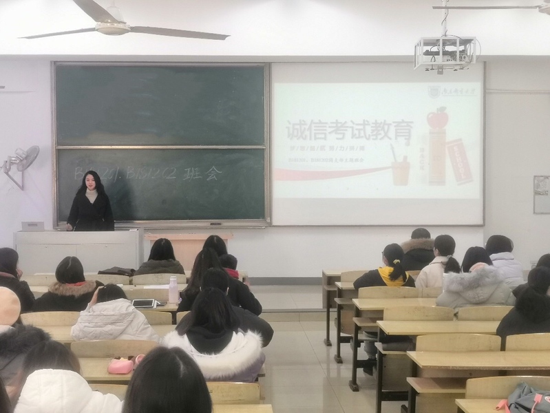首先,唐咏仪向大家介绍了诚实考试的意义,通过带领大家重新温习《学生手册》上有关考试纪律和考试违纪处理规定,警示大家诚信考试的重要性。同时,通过案例讲解、诚信考试宣传视频观看等方式,进一步加强了同学们对考风考纪的教育。最后,两个班学习委员组织所有同学集体签署了《考试诚信承诺书》,以表诚信考试决心。