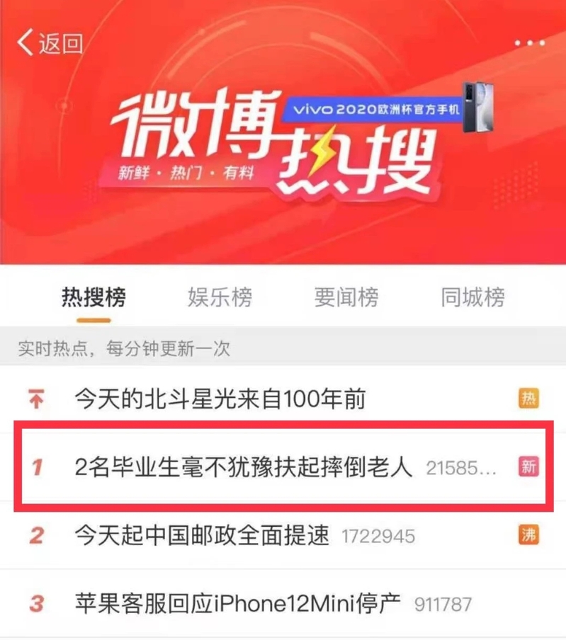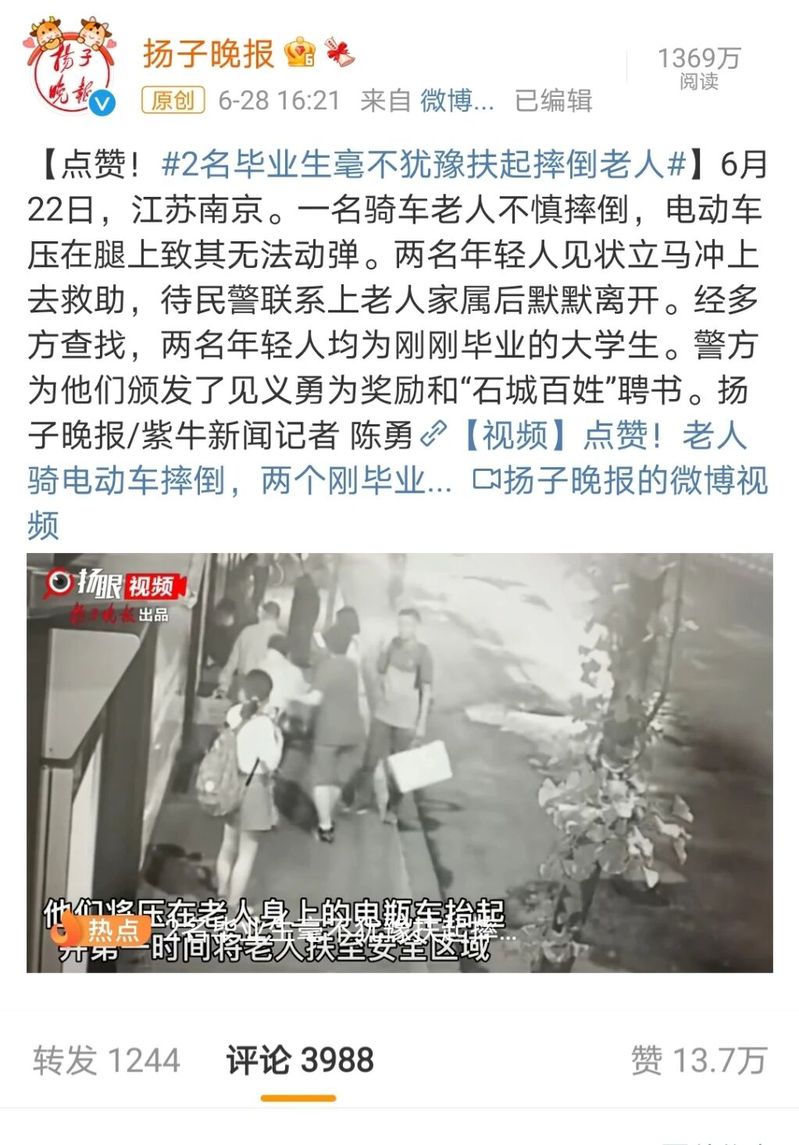 2021年6月22日晚九时许,在南京新庄公交站台附近一老人骑电动车不慎摔倒动弹不得,李星洲同学和其好友二人见状毫不犹豫救助摔倒的老人并理性施救。待民警联系上老人家属后,他们才默默离开现场。这份勇气,这份善举,这份义无反顾,一度冲向微博热搜榜第一名,引发广泛关注并受到众多点赞。