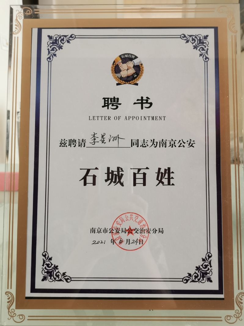 2021年6月24日,mg4355vip检测中心2021届毕业生李星洲同学被南京市公安局公交治安分局特颁发见义勇为表彰奖励和南京公安“石城百姓”聘书。