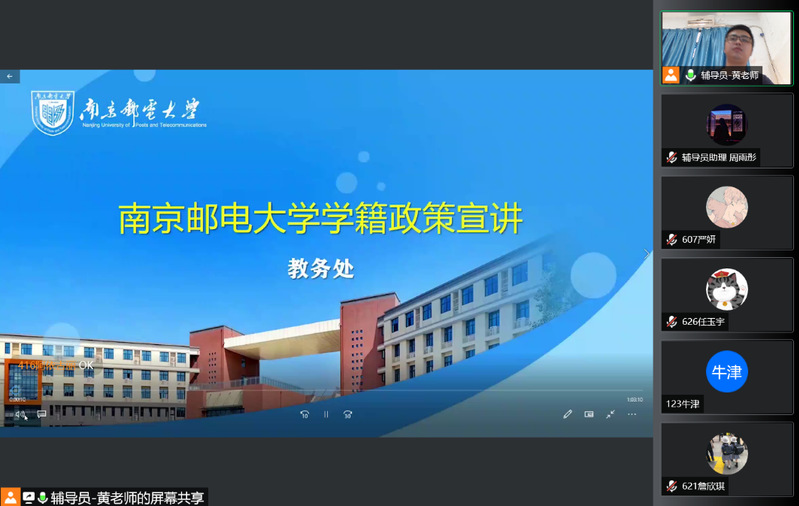 黄海生老师首先播放南邮春天、夏天和秋天校园景色介绍视频,带大家领略不同季节学校的美丽风光。在网络道德教育中,黄老师重点强调“互联网非法外之地”,并通过典型案例和事件进行讲解,希望新生能够依法上网、理性上网、文明上网,敢于表明自己的立场,驳斥错误的言论,对假恶丑现象坚决说“不”。随后黄老师播放了教务处学籍政策宣讲视频,并对大家重点关注的选课、绩点核算、转专业要求和保研条件等部分进行了集中解答。