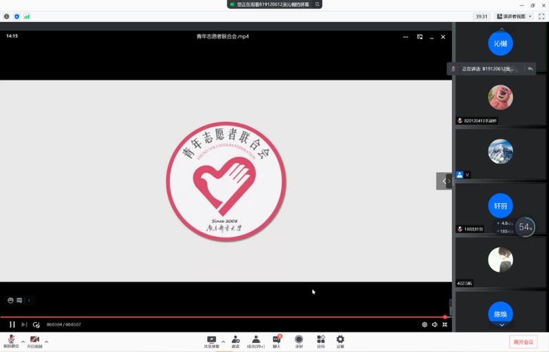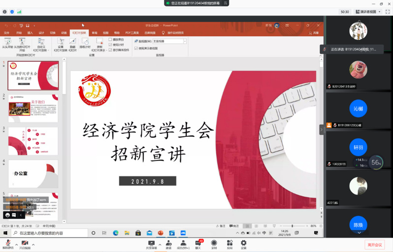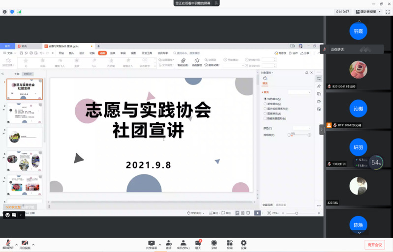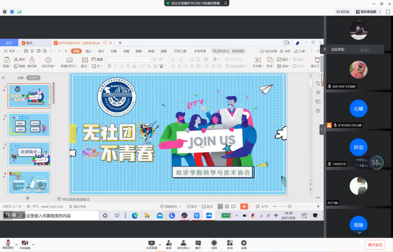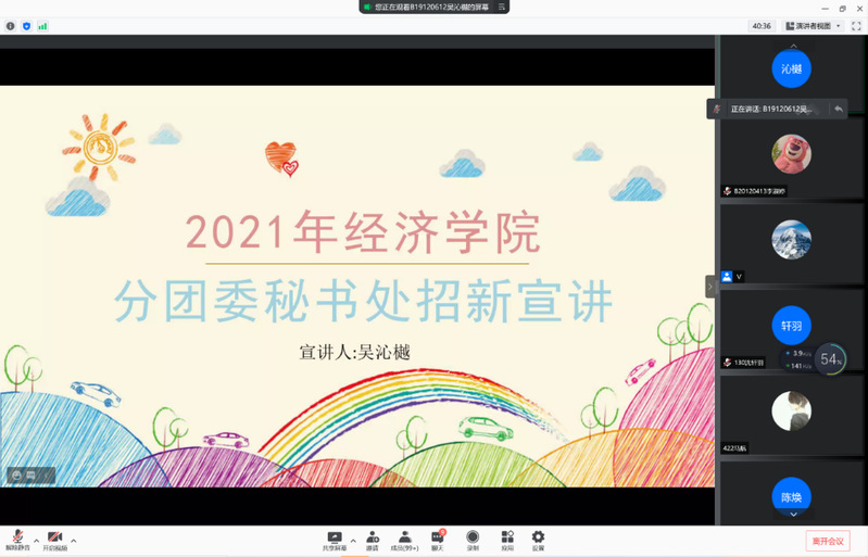 为丰富2021级新生的大学生活,促进他们对学生组织和社团的了解,2021年9月8日下午,mg4355vip检测中心2021级学生组织和社团宣讲会在线上举行。本次活动由mg4355vip检测中心分团委秘书处负责人吴沁樾同学主持,mg4355vip检测中心各学生组织、社团负责人及2021级全体新生参会。