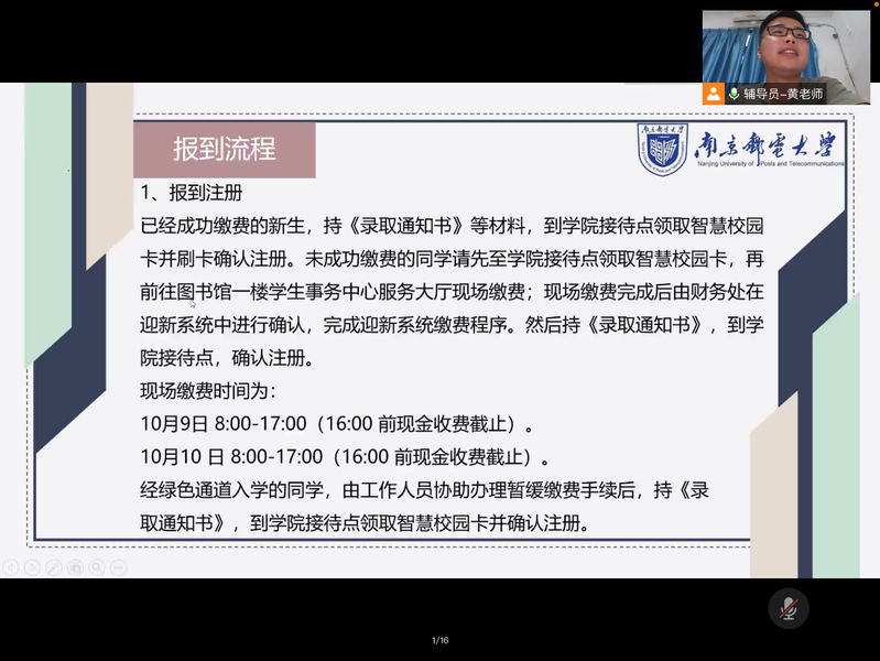 黄海生老师首先对暑假期间参加疫情防控志愿服务的13名先进个人进行表彰,同时也鼓励其他同学积极参与志愿实践与科研竞赛活动,不断提升自我。随后,黄老师就疫情防控与安全教育两个方面向同学们重申了在返校前、返校途中与返校后三个阶段需要引起重视的疫情防护和安全问题,对于因疫情暂缓返校地区的同学表示关心,同时也提醒所有同学国庆假期期间减少不必要的流动。最后,黄海生老师为同学们详细讲解了线下报到流程以及报到过程中的注意事项,并对同学们提出的疑问进行了细致的解答。