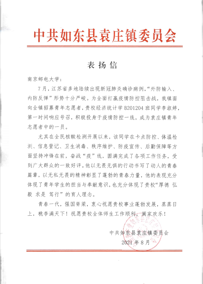 2021年8月,mg4355vip检测中心2020级B201203班李淑婷同学收到一封来自中共如东县袁庄镇委员会的表扬信。