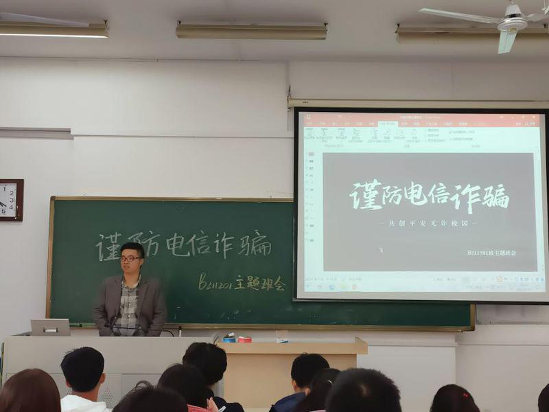 2021年11月11日下午,mg4355vip检测中心B211201班“预防电信网络诈骗,共创无诈平安校园”主题班会活动在教2-509教室举行。班主任杜运伟老师、辅导员黄海生老师应邀出席,B211201班全体学生参会。会议由班长杨光同学主持。