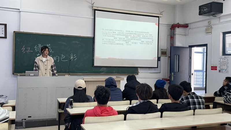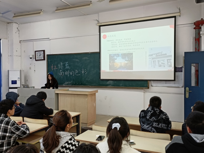 辅导员黄海生老师首先向大家介绍了此次班会的主题和背景,他从南邮的颜色是红绿蓝这一角度展开,详细阐述了南邮的过去、现在和未来。随后全体同学一起回顾了南邮的发展史,以PPT和视频的形式展示着这些年来南邮经历的大事件。同时为了让大家能对校史有更深入的了解,B211207班还举行了校史知识竞赛,全班学生分为A组,B组和C组,比赛有问答和抢答两种形式。在紧张激烈的问答中,同学们对南邮历史和南邮精神也有了很多新的理解。伴随着慷慨激昂的校歌《信达天下》,本次红色校史主题班会圆满结束。