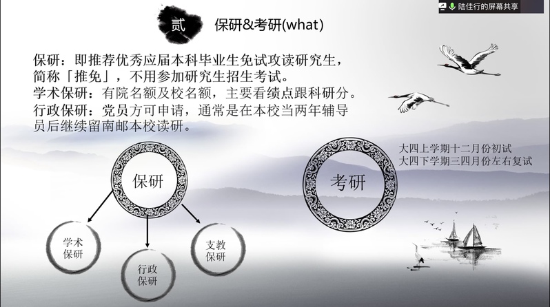 首先,王琴老师向同学们介绍了职业规划的相关基础知识,让同学们对职业规划有感性认识;又结合具体案例和专业知识,分析职业规划的方式方法。为了提升同学们的参与热情,王老师与同学们进行温馨的互动,邀请同学们分享成长历程,并以此为基础规划自己的大学生涯,在大学中不断的成长与收获,成就自己的人生价值。王老师强调:实践出真谛,职业规划还有待去生活中检验,面对新出现的问题,要找出其对应措施,对职业规划作出改进和完善。其次,叶茂坤学长和陆佳行、刘艾崟、钦林林三位学姐向同学们分享自己的考研选择、考研准备、出国留学、求职经验等,鼓励同学们应该有更高的站位和更远的目光,拥有更高层次的追求。最后,学长学姐还对同学们的学习和生活表达了关心,分享了压力缓解方法,鼓励同学们坚持锻炼,培养兴趣爱好。