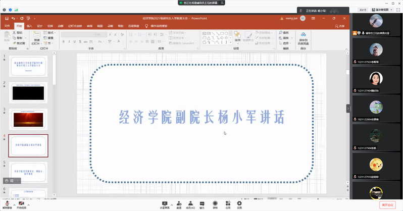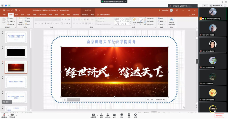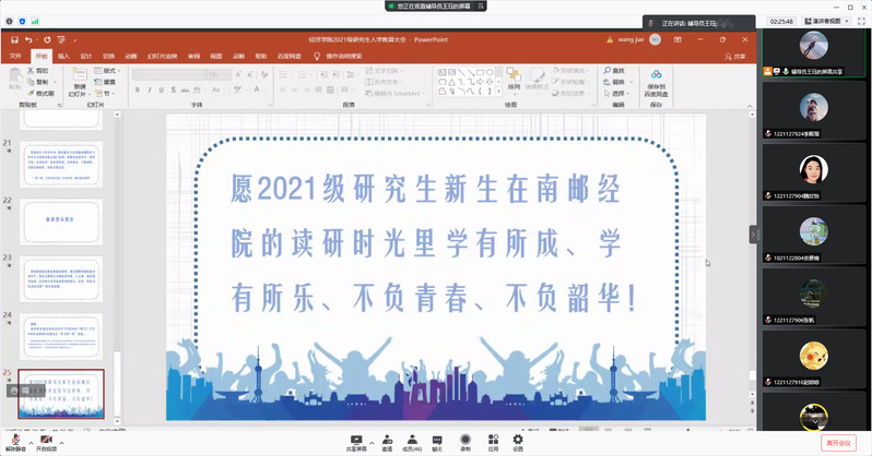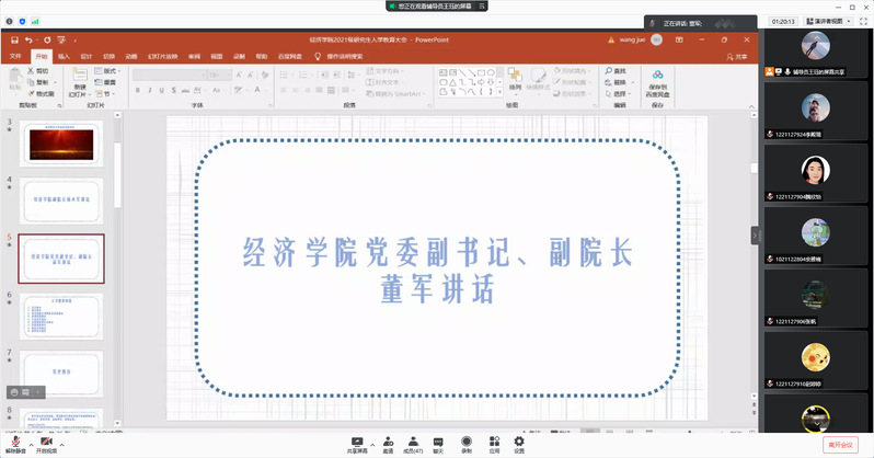 本次研究生线上入学教育大会,旨在帮助mg4355vip官网2021级研究生新生尽快适应在校学习生活,进一步明晰研究生阶段的培养、管理方式以及相关政策要求,以昂扬的斗志和崭新的精神面貌,科学合理地规划好自己未来三年的读研时光。