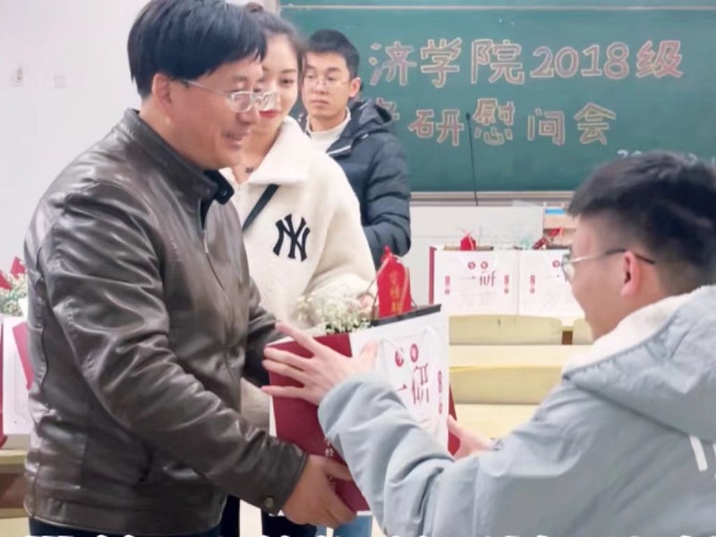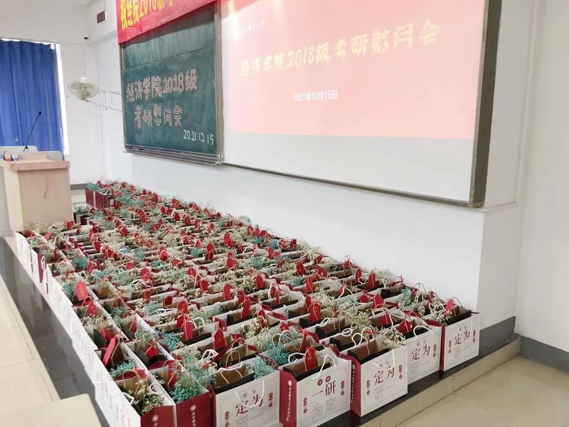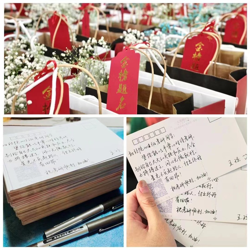 随后,老师们将学院精心准备的慰问礼包亲手发到每一位考研学子手中,传递了学院对于2018级考研学子的祝福与期待。慰问礼包中除了包含补充体力的食物饮品、寓意平安顺遂的苹果、象征祝福的满天星花束,更放有一张来自辅导员王珏亲手书写的祝福卡片。一字一句,表达了辅导员弄弄地关爱与祝福。正如卡片上所写:“星光不负赶路人,付出终将有回报!”愿大家放平心态,稳定发挥,考出期待的好成绩,无愧于自己的付出与努力!