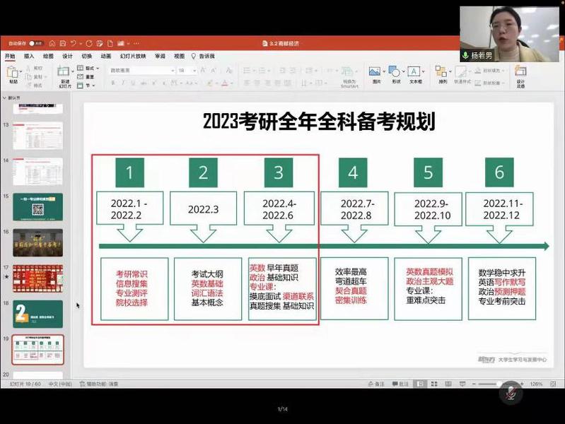 最后,会议邀请了杨若男老师来给同学们分享考研注意事项及准备工作。杨老师从考研目标入手,强调目标正确的重要性,然后分具体科目给同学们介绍了不同学科的学习方法,最后杨老师还给出了2023考研全年全科备考策划,帮助同学们制定合理的复习计划。