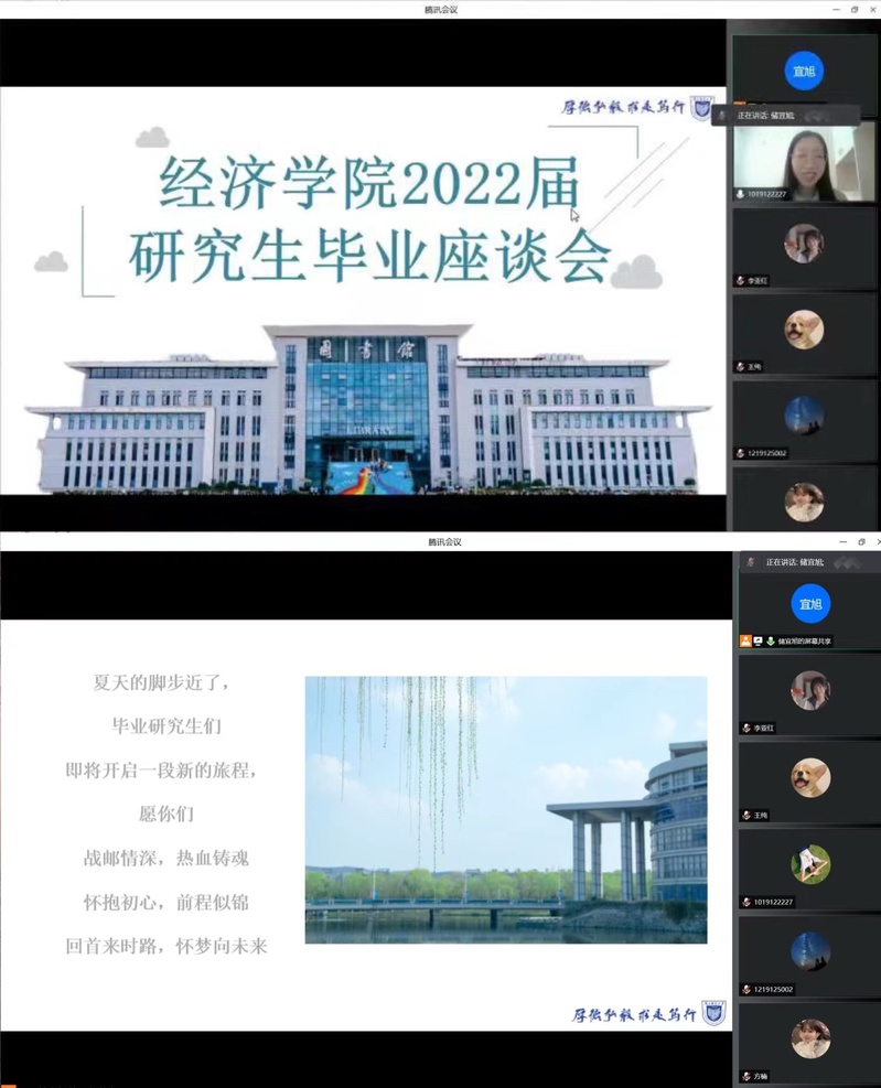4月15日上午,mg4355vip检测中心2022届研究生毕业座谈会在文科楼529会议室召开,线下线上同步进行。学院院长岳中刚、党委副书记兼副院长董军、副院长王子敏与毕业研究生亲切座谈。会议由辅导员储宜旭老师主持,全体毕业研究生参会。