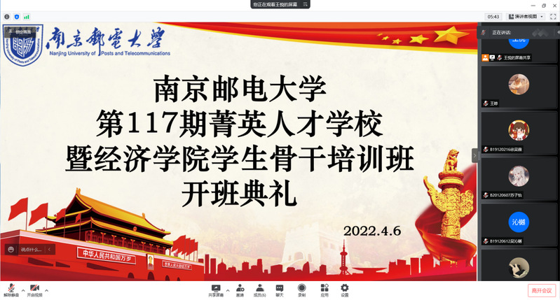 2022年4月6日下午,mg4355vip检测中心第117期大学生菁英人才学校暨mg4355vip检测中心学生骨干培训班开班典礼线上线下同步举行。mg4355vip检测中心党委副书记兼副院长董军老师、mg4355vip检测中心分团委书记尤波老师和117期菁英班各组组长在文科楼523会议室线下参加了本次活动,其余学员线上参与。开班典礼由团委秘书处朱妍同学主持。