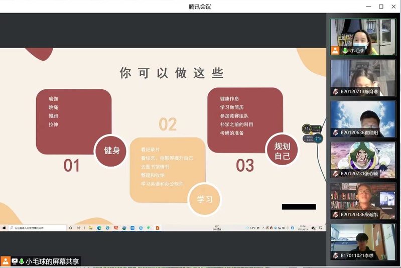 会议伊始,董军老师就目前的疫情发展形势进行了分析,解释说明了学校采取的疫情防控措施,希望同学们能够理解并配合学校的管理;鼓励同学们要保持良好心态,在线上课期间更要营造良好的学习氛围,提高自制力,珍惜时间。其次,杜老师再次强调疫情期间学校的管理规定。主要包括核酸检测、出校申请、信息报送和网课学习四部分。最后,杜老师为同学们提出了疫情隔离期间的小建议。生活上,同学们可以加强体育运动,以提高个人体质;学习上,一方面,同学们可以通过看书、看纪录片、学习英语和办公软件来提升自己;另一方面,同学们要好好地规划自己,如参加竞赛、补学之前的科目等。