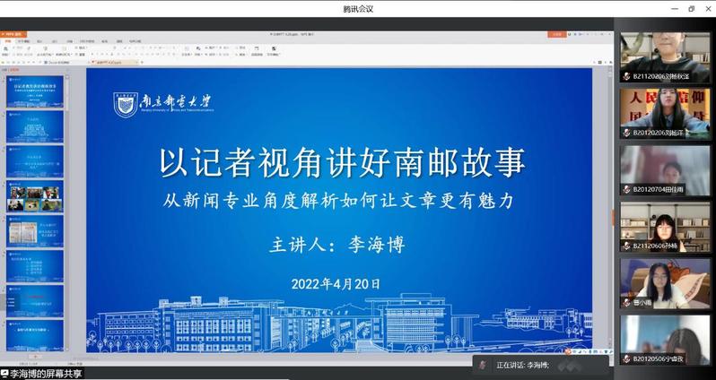2022年4月20日下午,mg4355vip检测中心第117期大学生菁英人才学校暨mg4355vip检测中心骨干培训班第二课于线上顺利举行。本次课程主讲人为mg4355vip检测中心党委宣传部李海博老师,主题为《以记者视角讲好南邮故事——从新闻专业角度解析如何让文章更有魅力》。