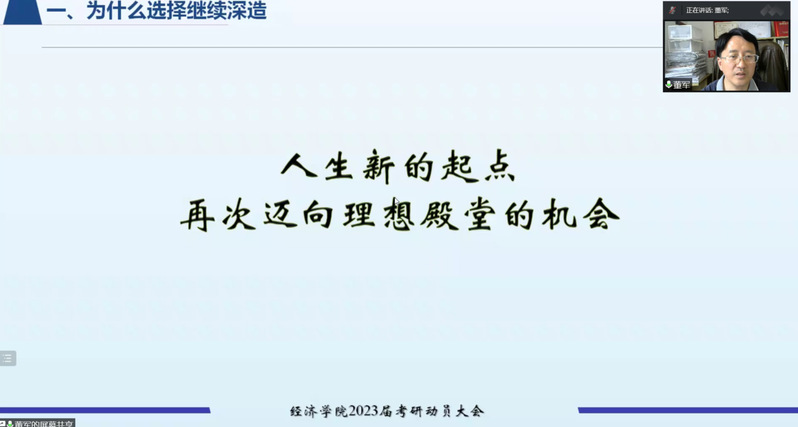 随后,董军副书记则从“为什么选择继续深造”、“如何准备考研或出国留学”、“2022届毕业生升学情况分析”、“继续深造的几点建议”四方面展开,从读研、深造的重要性到准备阶段的方法论再到现实情况的具体分析,耐心地为同学们解开疑惑,最终浓缩出9条具体经验与技巧为同学们提出建议。