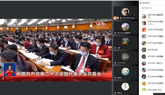 2022年10月16日10时,中国共产党第二十次全国代表大会于北京人民大会堂隆重开幕,mg4355vip检测中心mg4355vip检测中心各团支部、学生会、分团委秘书处、学生社团准时观看本次大会直播,学院团学骨干代表在文科楼523会议室进行集中观看,认真学习习近平总书记代表十九届中央委员会向大会所作的报告并做好学习记录。