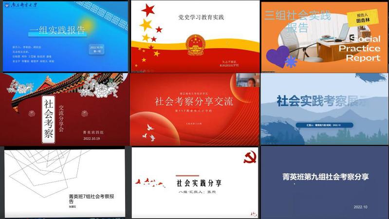 菁英班学员们依照社会考察方案在暑期参加了“三下乡”社会实践活动,并于国庆期间前往雨花台烈士陵园等多处红色纪念地进行了实地调研。学员们反映此次学习与实践之旅给他们留下了深刻的印象。在分享会上,各小组派出代表集中展示社会实践成果,总结社会考察经验。各小组成员积极围绕社会考察内容进行交流探讨,分享心得体会,交流现场十分活跃。