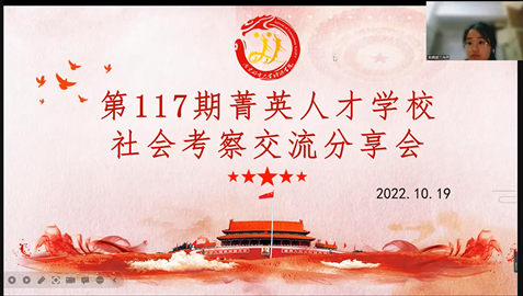 2022年10月19日下午,mg4355vip检测中心第一百一十七期菁英人才学校暨mg4355vip检测中心骨干培训班社会考察交流分享会在线上顺利举行。菁英班全体学员参加了本次会议。