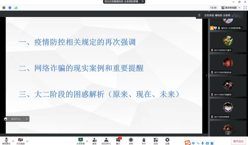首先,王老师再次为全体学生分析了当前疫情形势的复杂性和严峻性,叮嘱全体同学严格遵守疫情防控各项规定,每天按时参加校内核酸检测,按时完成健康打卡,严于律己,守护好校园安全稳定。接着,王老师从实际案例出发,提醒同学们要切实增强网络防诈意识,提高预判能力,遇到不确定的情况及时与父母和辅导员老师沟通联系,切不可擅自贸然做出决定,以免不慎上当受骗,造成不必要的财产损失。最后,王老师就近期同学们提出的疑惑困惑进行了统一解答,主要涉及未来规划和个人学习计划的制定,以实例入手,嘱咐同学们在制定计划时一定要符合自身的实际情况,不可太过空泛,也不需人云亦云,分析好自己的优劣势,制定属于自己的目标和规划,一步一个脚印去实践、去进步。