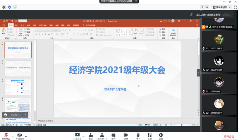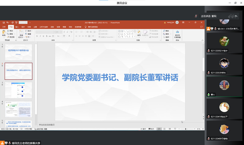 2022年10月26日下午,mg4355vip检测中心召开了2021级本科生大二上第三次年级大会。本次会议通过线上进行,学院党委副书记、副院长董军应邀出席,2021级全体同学参会,会议由辅导员王珏主持。