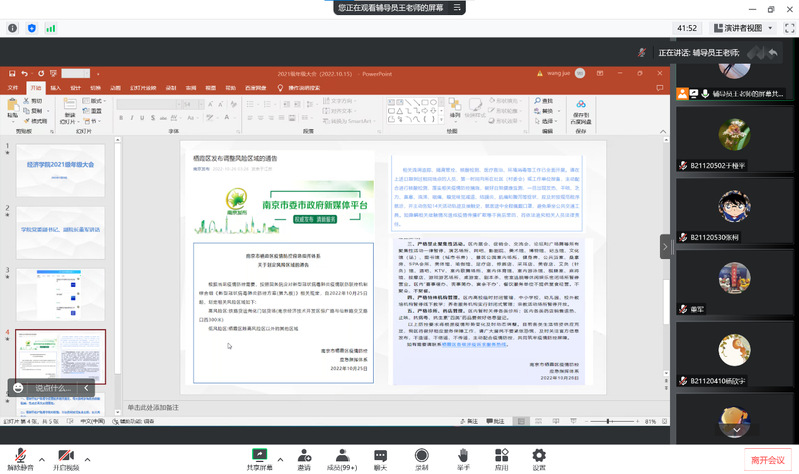 接着,王老师对于当前疫情形势、学校防疫要求、校纪校规遵守等方面做了再次强调。叮嘱同学们在获取各类信息时,要以官方发布的信息为准,不信谣、不传谣、不造谣。此外,王老师从严峻的就业形势出发,提醒同学们要端正态度,严于律己,