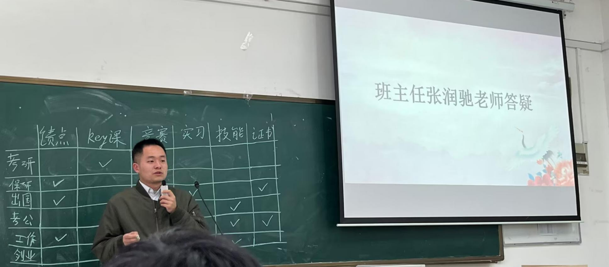 班主任张润驰老师就大家的培养方案和未来发展为同学们答疑解惑。张老师从大学发展的六方面和未来同学们可选择的六大出路具体详细地分析了每一条道路具体努力的方向和注重的要点,并通过线下直接提问和线上匿名讨论两种方式,让同学们畅所欲言,班会现场讨论热烈。