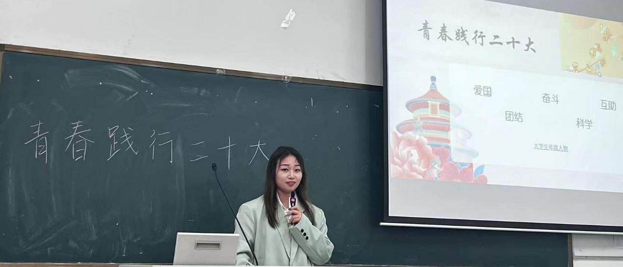 接着,班长严亚楠围绕“青春践行二十大”的主题,从爱国、团结、奋斗、科学、互助五方面切入展开,传爱国之精神,担青春之使命.从爱国方面,严亚楠同学为大家播放了中国共产党国际形象宣传片,鼓舞同学们坚定理想信念,以青春之我,创建青春之民族。弘扬宪法精神,遵守法纪法规,从法纪法规教育方面,班长再次加强了同学们的国家意识,权利义务意识和守法用法意识;此外严亚楠同学还与同学们分享了《追风筝的人》中一句名言,并提醒同学们学会感恩,与爱同行。