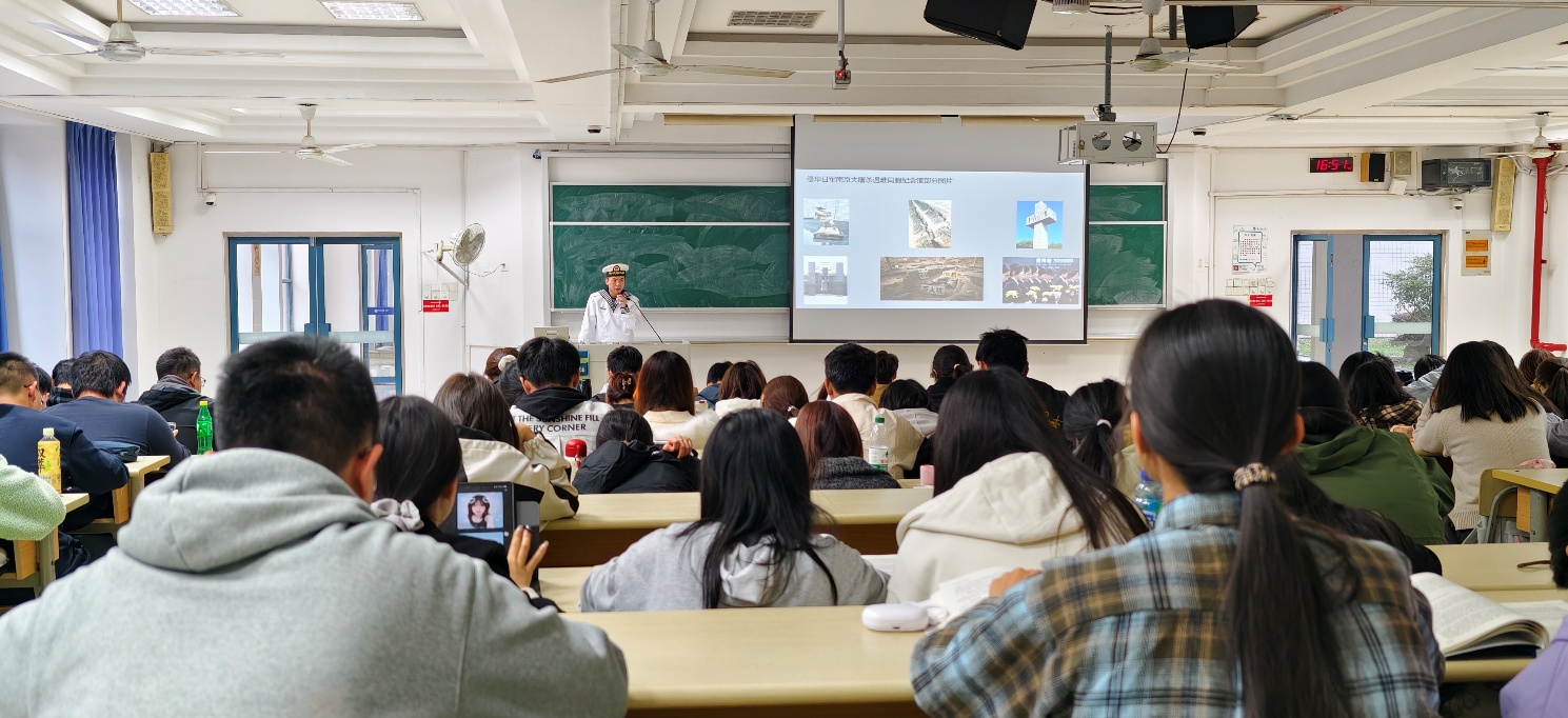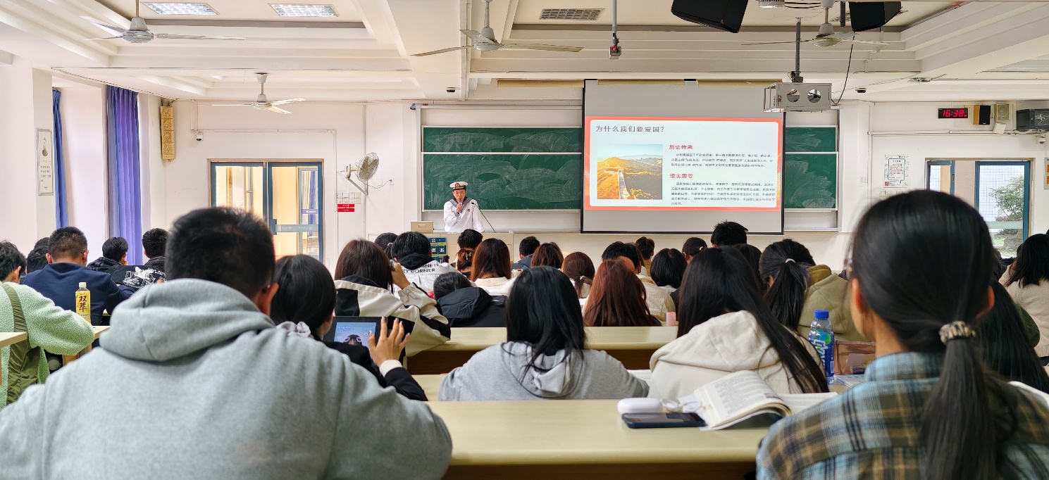 首先,刘子杰系统阐述了新时代爱国主义的核心要义。他强调,爱国主义是中华民族精神的核心,是维护国家主权、安全与发展利益的根本要求。在新时代,爱国主义体现为爱国、爱党、爱社会主义的高度统一,要求青年将个人理想融入民族复兴的伟大征程。刘子杰还带领学弟学妹们回顾了中国近代以来几次关键海战的历史教训与启示,包括甲午黄海海战的屈辱、西沙自卫反击战的英勇,深刻阐释了巩固海权、建设强大海军对国家安全的重大意义。