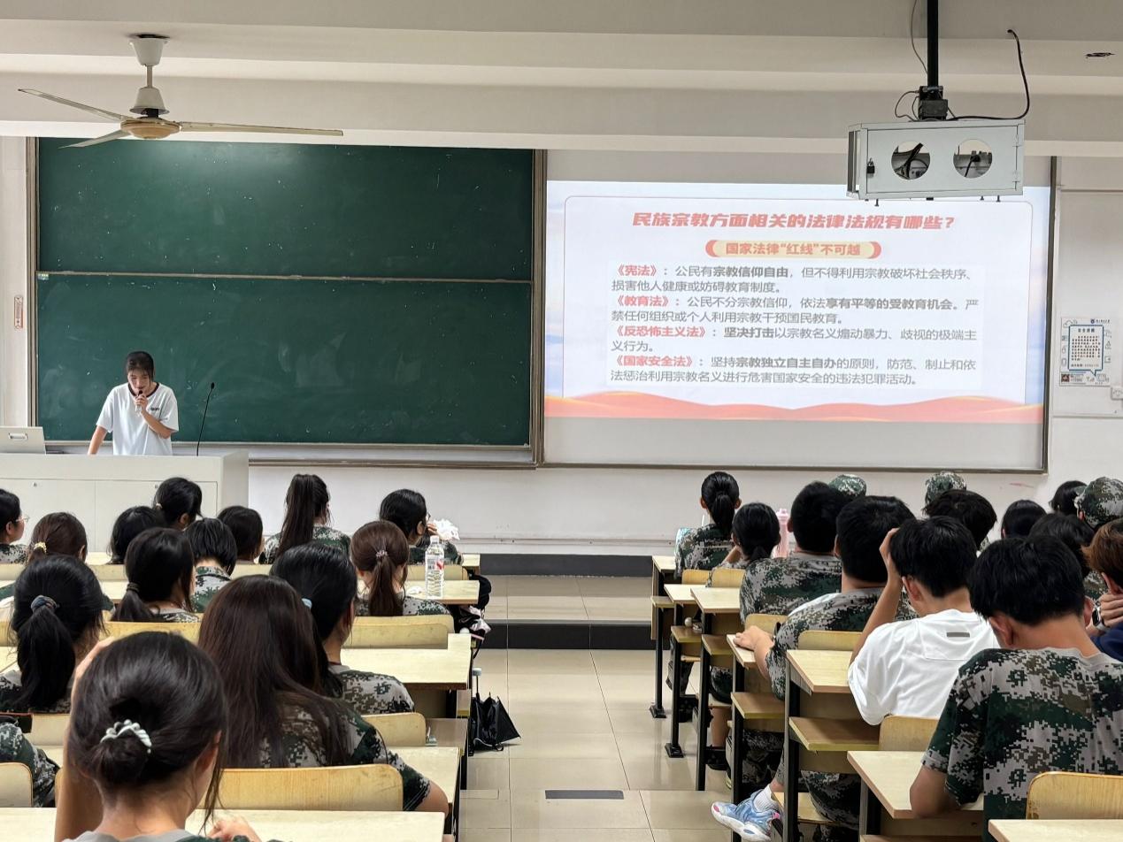 首先,大会从“认知篇”切入,朱宇露带领同学们系统学习了团章,深刻阐述了共青团作为党的助手和后备军的光荣定位与性质宗旨,引导新生筑牢“坚定不移跟党走”的信仰根基。接着进入“明责篇”,她清晰列举了团员的权利与义务,强调将责任意识融入日常学习与生活,并重温入团誓词,激励大家珍惜团员身份,履行团员义务。随后,在重点环节“守纪篇”中,她深入解读团纪处分条例,结合高校实际案例划出行为“红线”,强化了团员们的纪律规矩意识。此外,大会还设置了民族宗教政策专题学习板块,普及相关法律法规,揭露校园非法传教的隐蔽形式,有效提升了新生辨别与抵制渗透的能力。最后,会议简要说明了团员档案转接的实务要求,为新生顺利融入组织提供了明确指引。
