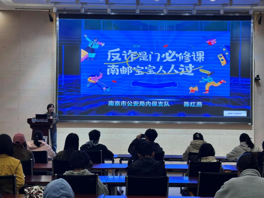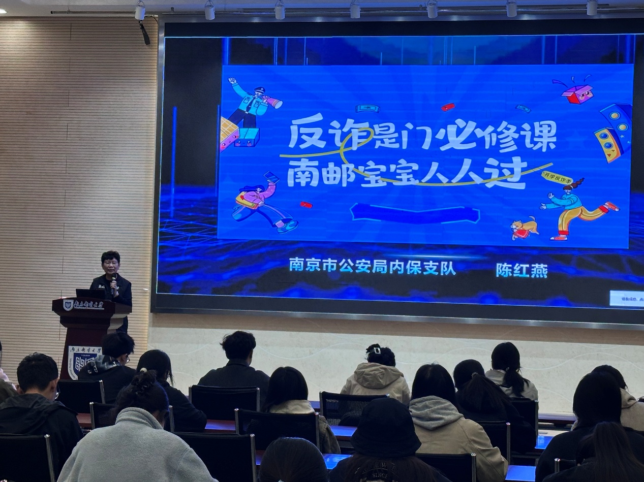 为全面提升学生防范电信网络诈骗的意识和能力,筑牢校园安全防线,2025年10月21日下午,mg4355vip检测中心在中兴报告厅举办“反诈是门必修课,南邮宝宝人人过”主题讲座。本次活动特邀南京市公安局内保支队反诈专家、金牌讲师陈红燕警官担任主讲,学院党委副书记、副院长吴迪出席,mg4355vip检测中心2025级全体研究生、本科学生骨干参会。