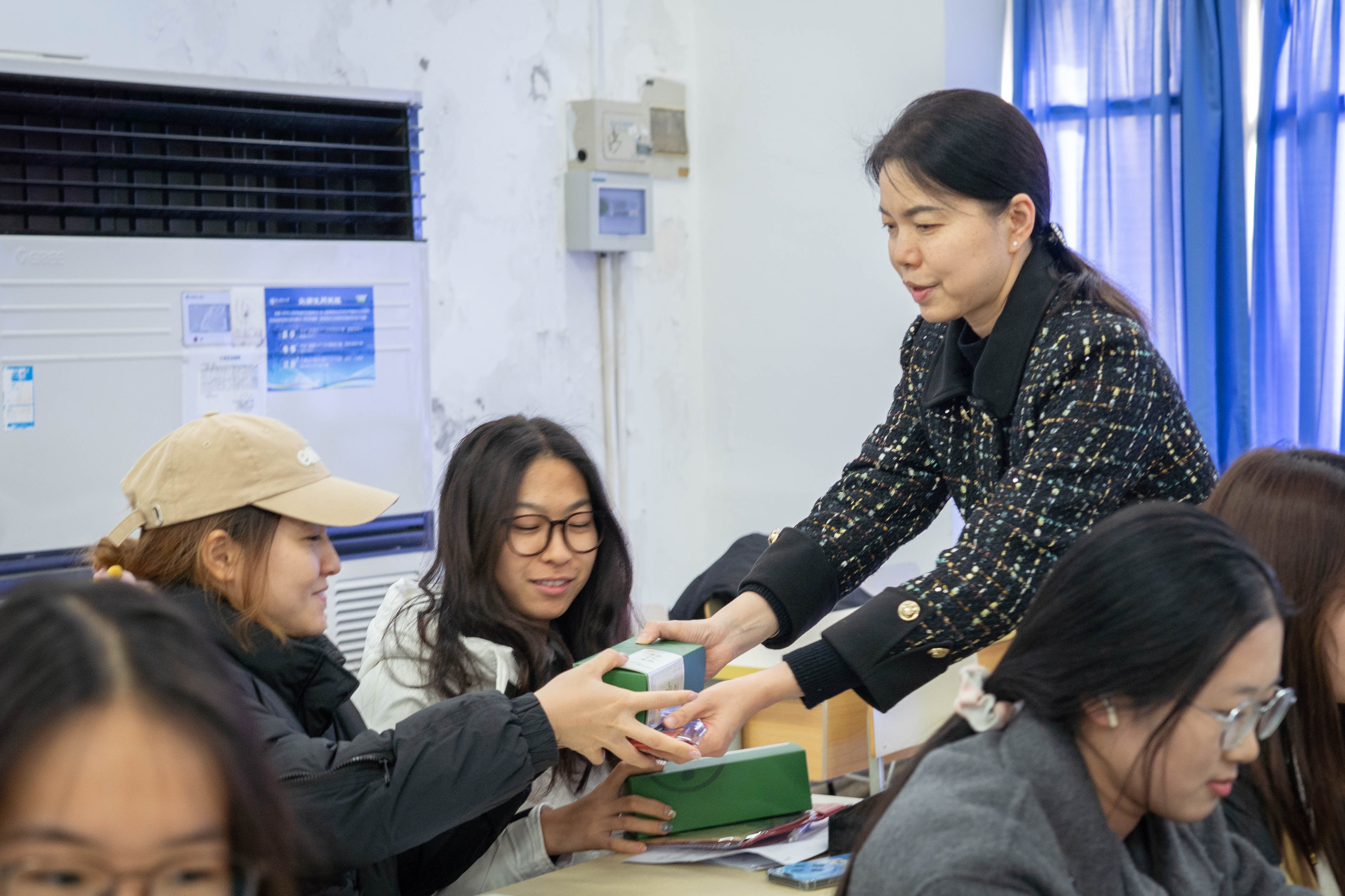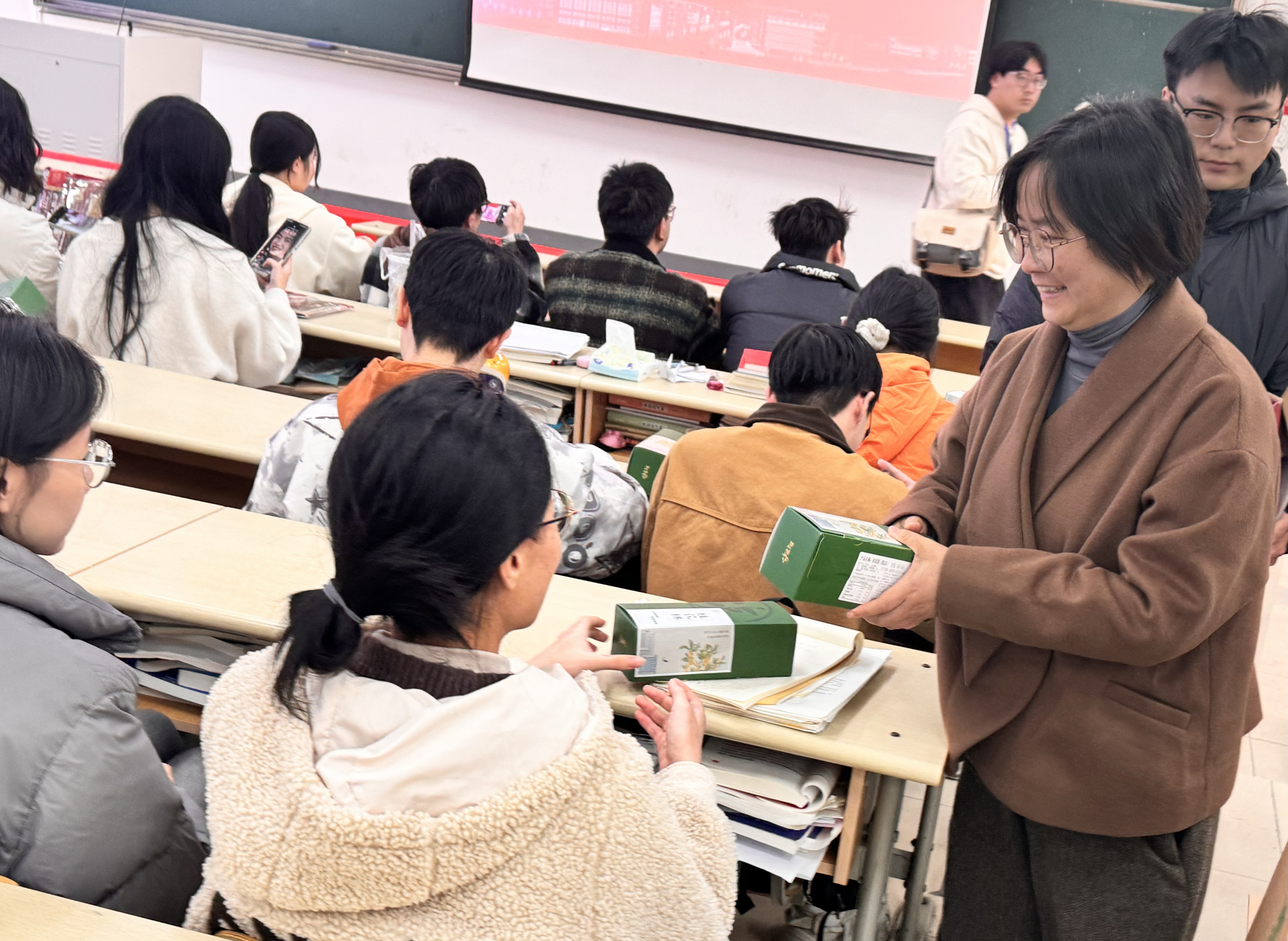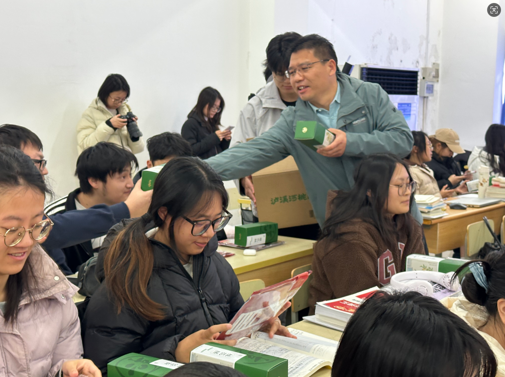 伴随着温馨的音乐,胡校长与学院的领导、辅导员老师们一同为同学们送上了精心准备的“暖心加油包”。其中,既有寓意“蟾宫折桂”的香甜桂花糕,还有一份份刻印着“金榜题名”字样的定制文具。这份精心筹备的慰问品,既是对学子们备考付出的肯定,更承载着学校与学院对大家金榜题名的殷切期盼。