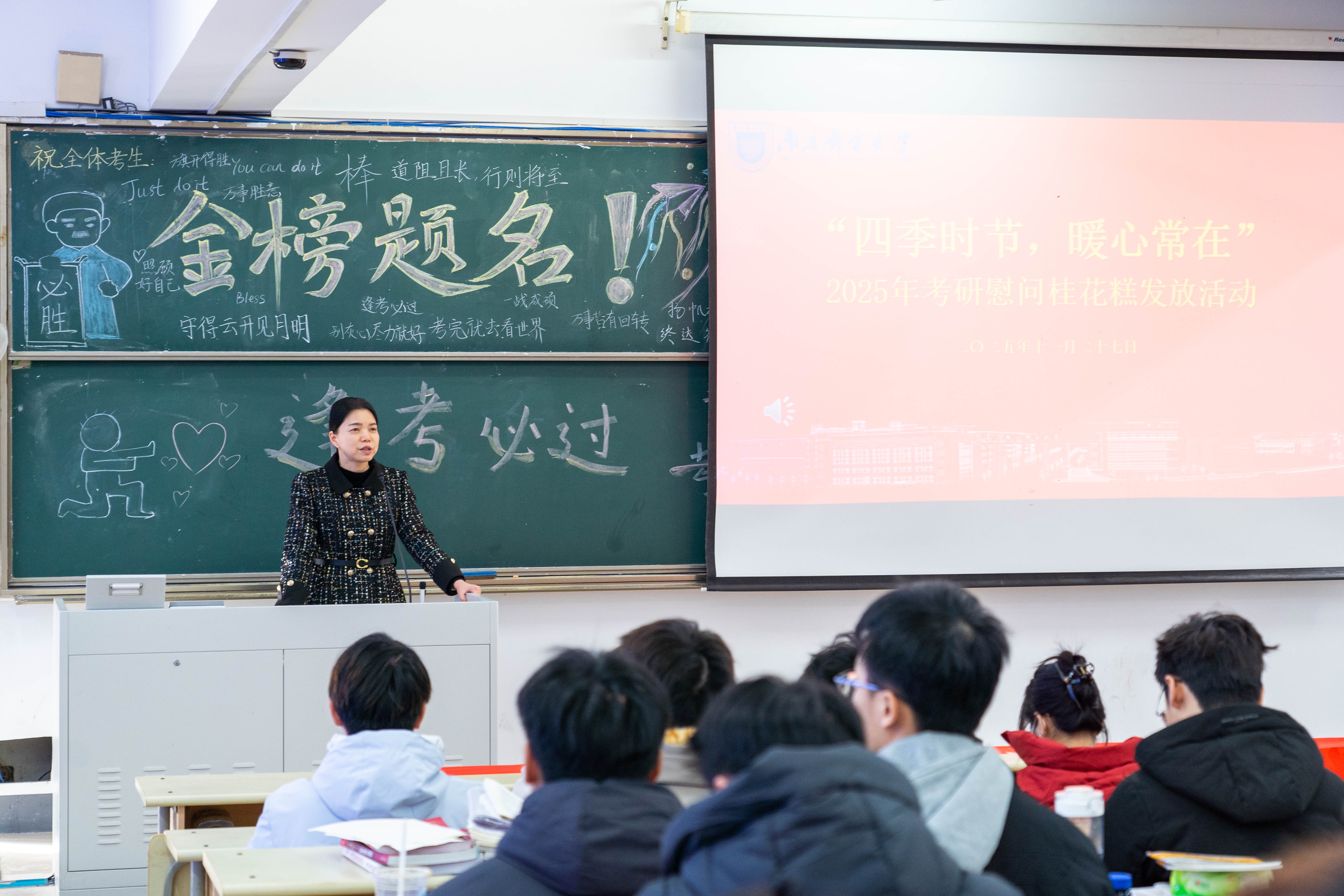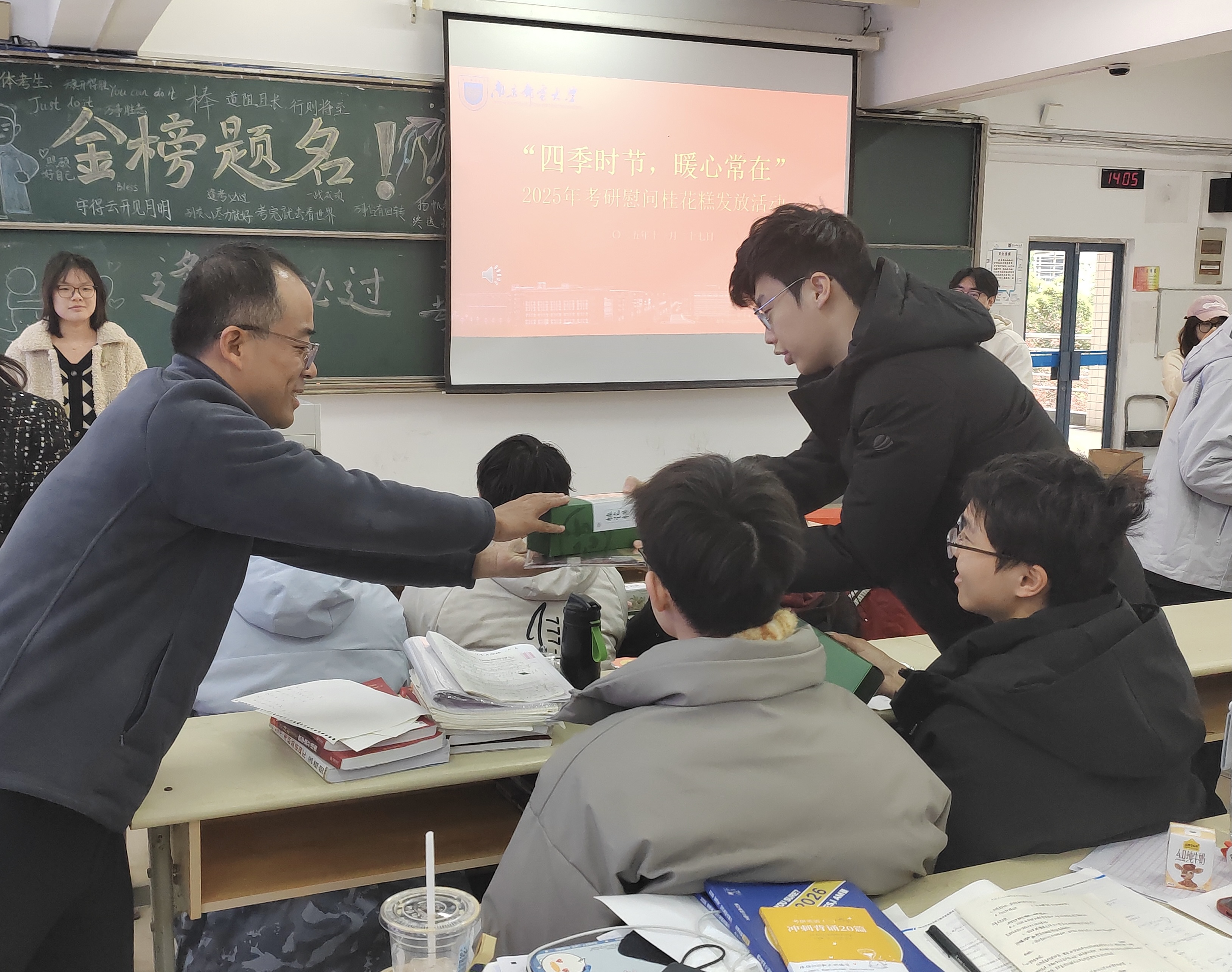 为切实做好考研学子服务保障工作,传递学校与学院的深切关怀,11月27日下午,mg4355vip检测中心于教4-201举办“四季时节,暖心常在”2025届考研慰问桂花糕发放活动。mg4355vip检测中心党委常委、副校长胡纵宇,mg4355vip检测中心党委书记刘挺、党委副书记吴迪、副院长杜运伟、分团委书记尤波、2022级辅导员储宜旭、2024级辅导员周洪山参与本次活动。