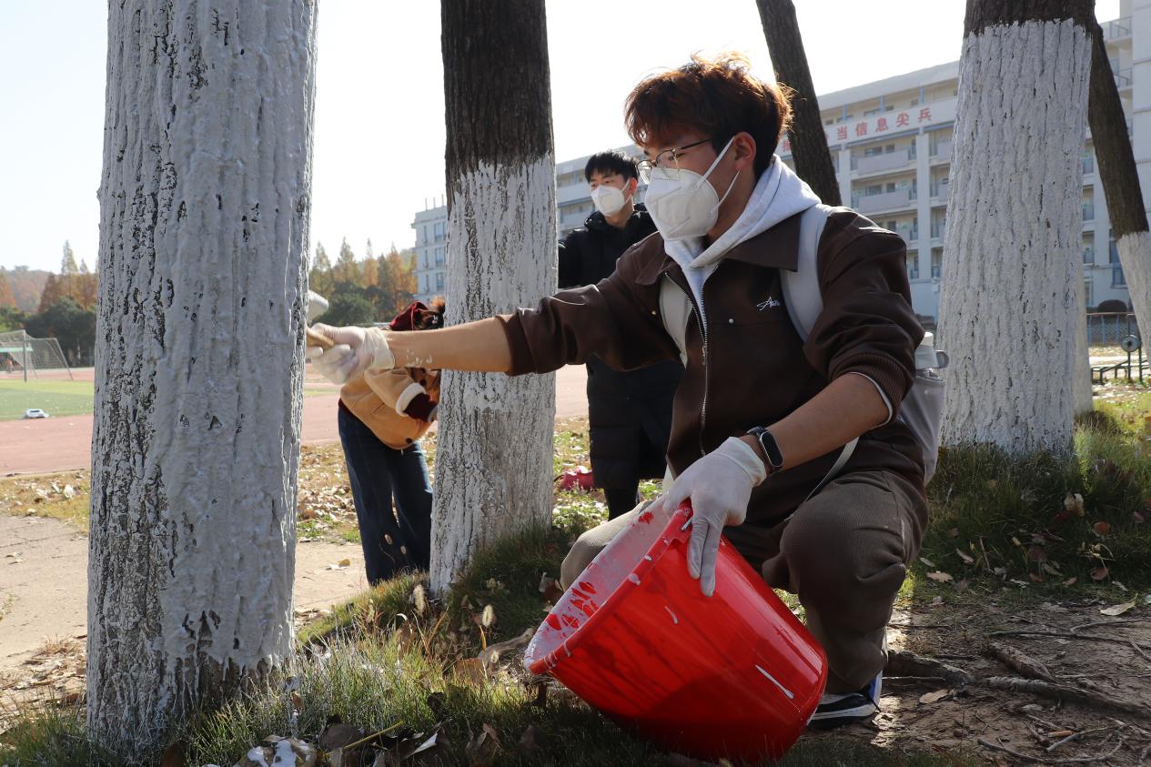 活动初始,后勤管理处工作人员为同学们讲解了树干涂白的原理,学生们认识到,为树木刷上特制涂料,不仅有防虫杀菌的作用,并且具有反射阳光、防止树皮冻裂等多重保护作用,能够帮助树木安全越冬。听完讲解后,同学们领取了刷子、小桶、手套以及口罩,在后勤管理处工作人员的示范下开始进行树干涂白劳动,冬日暖阳下,操场旁的树林里是同学与老师们劳动的身影,为树木换上了崭新的“御寒外衣”。